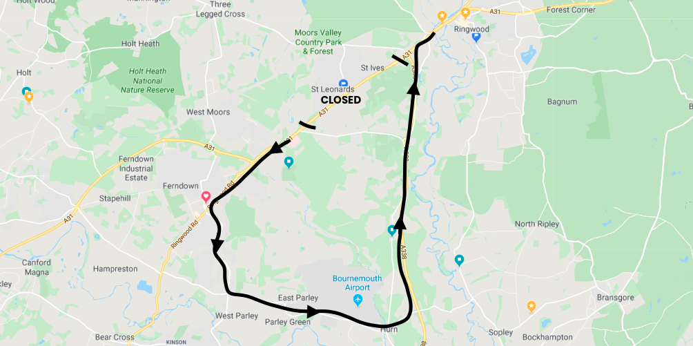 Eastbound traffic will be diverted via Ferndown, West Parley, Hurn and the A338, whilst westbound traffic will be down to a single lane.