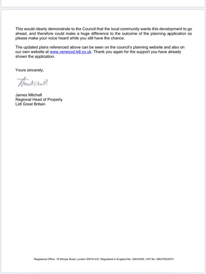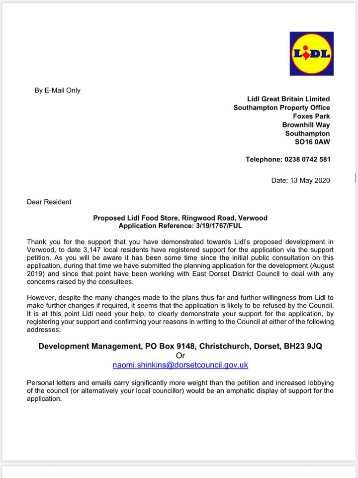 Lidl is asking Verwood residents to write to the Council showing support for its proposed store in the town.