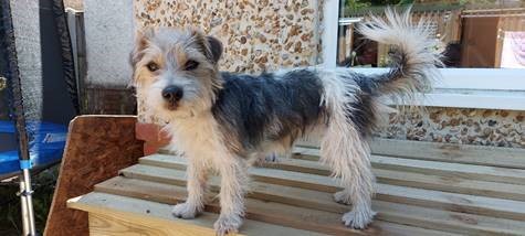 The dog is described as a female Parsons Russell crossed with a Jack Russell called Perdy. She may be fluffier and lighter than in the image due to her winter coat.