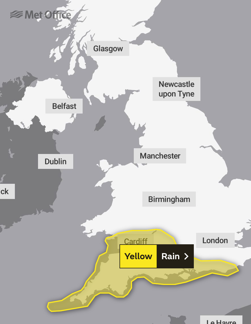 The Met Office has issued a yellow weather warning for the south coast, with heavy rain and thunderstorms expected in Verwood.