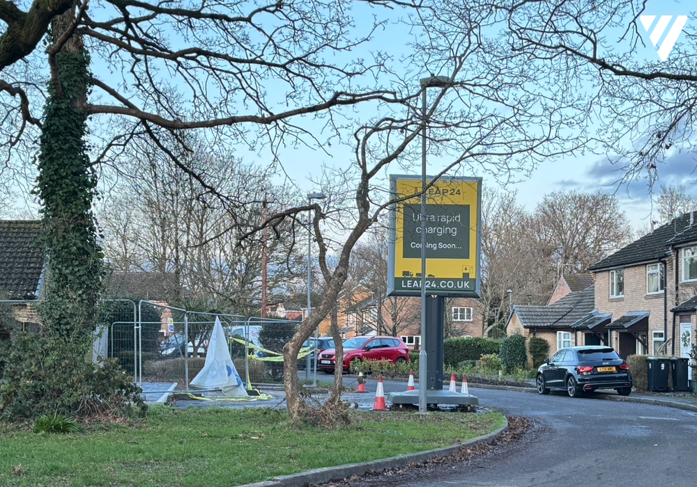 The billboard is advertising the arrival of “Ultra rapid charging” on a piece of land previously used for local parking.